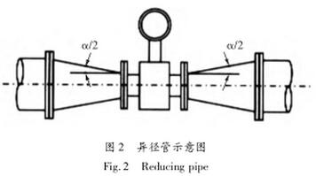 (12)當管道內流速偏低,工藝流量又較穩定,為滿足儀表對流速范圍的要求,在儀表部分局部提報流速,可選擇流量計口徑小于工藝管道,并在流量計的前后加接異徑管。為了在安裝異徑管后不過多影響流場分布,不影響污水流量計的精度,要求異徑管的中心錐角α不大于15°,越小越好。這樣可把異徑管視為直管段的一部分。