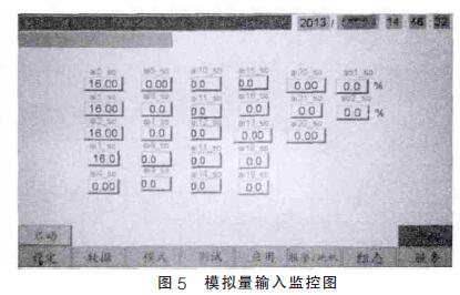 上位機觸控屏軟件是利用觸控屏供應(yīng)商的組態(tài)軟件設(shè)計的,作為一個將運用于工業(yè)現(xiàn)場的監(jiān)控設(shè)備,其實用性和易用性是使用者比較重視的。當(dāng)下位機的通訊任務(wù)接收到信號量, 主控制模塊就會開始和上位機通信。下位機將采集到處理完整的數(shù)據(jù)傳輸?shù)缴衔粰C內(nèi),上位機將其顯示到觸控屏上,使用者可以通過上位機了解空壓機組的實時狀態(tài)。圖5 和圖6 就是模擬量和數(shù)字量各個通道的實時值顯示畫面。