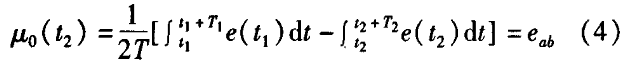 冷卻水流量計(jì)一般都采用工頻交流電源供電,其電源電壓的幅值和頻率的變化都會(huì)給冷卻水流量計(jì)帶來電源性干擾噪聲。對(duì)電源電壓的幅值變化,因采用多級(jí)集成穩(wěn)壓,一般而言電源電壓的幅值變化對(duì)電磁流量的測(cè)量精度影響不大。當(dāng)電源電壓的頻率波動(dòng)時(shí),雖然其波動(dòng)范圍有限,但對(duì)冷卻水流量計(jì)測(cè)量精度影響較大。為了解決工頻干擾問題,實(shí)現(xiàn)對(duì)流體流速感應(yīng)電勢(shì)e柚信號(hào)的準(zhǔn)確測(cè)量,需利用以下基本關(guān)系:①勵(lì)磁周期為工頻周期的整數(shù)倍,即勵(lì)磁頻率為50/nHz(n為偶數(shù));②正負(fù)勵(lì)磁下的同相位采樣。圖2是對(duì)應(yīng)低頻矩形波勵(lì)磁形式下的典型電勢(shì)信號(hào)形式,按上述關(guān)系在一個(gè)勵(lì)磁周期下,若假設(shè)t。和t:點(diǎn)為工頻干擾的等效干擾點(diǎn),且采樣寬度T=T1=T2,則e –ab的基本算式為:,