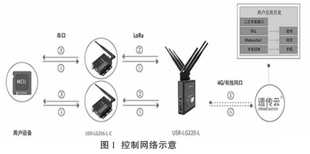 基于 LoRa 技術的無線流量計由控制,計量,通信,電源,存儲五個模塊組成。以污泥回流流量計為主體的計量模塊將采集到的供暖管道數據發送到通信模塊,基于 LoRa 技術的通信模塊將流量數據存儲并且發送到由管理人員監控的控制模塊,管理人員通過控制模塊和通信模塊向流量計發送指示。電源模塊是無線流量計的能源中心,可以為流量計的其他模塊提供動力支持。流量計安裝完畢后可在小區內形成控制網絡,網絡示意圖如圖 1 所示。