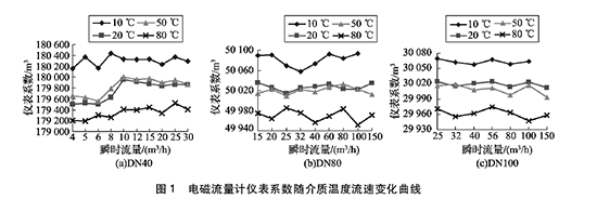 將實驗測得的電磁流量計dn350在不同溫度及流速下的儀表系數數據整理,特性曲線如圖1所示,3組曲線分別對應DN40, DN80, DN100的3塊電磁流量計dn350的儀表系數曲線。