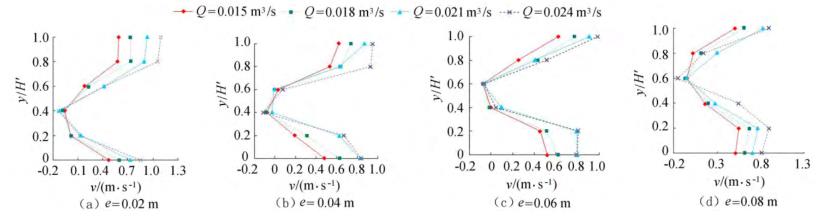 圖4橫坐標(biāo)為斷面水流方向流速,縱坐標(biāo)為測(cè)點(diǎn)垂向位置與下游水位的比值y/H'。隨著浮體結(jié)構(gòu)位置的上升,*小斷面流速位置同樣上升。以圖3(a)為例,當(dāng)e=0.02m時(shí),下游斷面位置自下而上呈現(xiàn)先減小、后增大的趨勢(shì),在y/H'=0.40時(shí)流速達(dá)到*小,隨著浮體結(jié)構(gòu)位置的上升,*小流速呈現(xiàn)向上偏移的趨勢(shì)。在斷面位置y/H'=0.20時(shí),隨著e的增大,流速呈現(xiàn)增大的趨勢(shì)。當(dāng)e較小時(shí),流經(jīng)浮體結(jié)構(gòu)下部進(jìn)行下泄的水流較少,主流出現(xiàn)在浮體結(jié)構(gòu)的上部,且在浮體結(jié)構(gòu)的阻擋作用下出現(xiàn)回流區(qū);隨著e上升,主流偏向浮體結(jié)構(gòu)下部區(qū)域,流速增大。與y/H'=0.20的流速分布正好相反,當(dāng)y/H'=0.80時(shí),流速分布隨著浮體位置的增大而減小。隨著e的增大,通過(guò)浮體結(jié)構(gòu)下部泄流的水體增多,主流開(kāi)始向下偏移。試驗(yàn)過(guò)程中,浮體結(jié)構(gòu)處于淹沒(méi)狀態(tài),流速的分布隨著浮體位置的改變呈現(xiàn)上大、中小、下大的分布趨勢(shì),在浮體結(jié)構(gòu)下游區(qū)域形成回流區(qū),回流區(qū)的位置隨著浮體結(jié)構(gòu)的上升而上升。