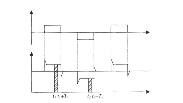 給水廠原水電磁流量計一般都采用工頻交流電源供電, 其電源電壓的幅值和頻率的變化都會給給水廠原水電磁流量計帶來電源性干擾噪聲。對電源電壓的幅值變化, 因采用多級集成穩壓, 一般而言電源電壓的幅值變化對電磁流量的測量精度影響不大。當電源電壓的頻率波動時, 雖然其波動范圍有限, 但對給水廠原水電磁流量計測量精度影響較大。為了解決工頻干擾問題, 實現對流體流速感應電勢eab信號的準確測量, 需利用以下基本關系:①勵磁周期為工頻周期的整數倍, 即勵磁頻率為50/nHz(n為偶數);②正負勵磁下的同相位采樣。圖2是對應低頻矩形波勵磁形式下的典型電勢信號形式, 按上述關系在一個勵磁周期下, 若假設t1 和t2 點為工頻干擾的等效干擾點, 且采樣寬度T=T1 =T2 , 則eab的基本算式為: