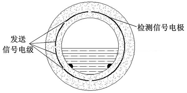 ③利用阻抗或信號衰減研制的非滿管一寸管污水流量計。這種結構的非滿管一寸管污水流量計是當前國內研究的方向之一。其結構是流量管底部貼一對信號發射電極,在流量管中間貼信號接收電極。由于信號在流體中傳播會產生衰減,且傳播時間越長,衰減越多,因此通過信號接收電極接收到的信號衰減量即可得知液面高度;同時該電極還能測量流體切割磁感線產生的電動勢,以此達到測量非滿管流量的目的。阻抗式或信號衰減非滿管一寸管污水流量計結構簡圖如圖5所示。