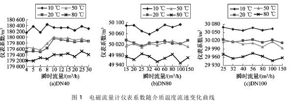 將實驗測得的dn150深井水流量計在不同溫度及流速下的儀表系數數據整理,特性曲線如圖1所示,3組曲線分別對應DN40、DN80、DN100的3塊dn150深井水流量計的儀表系數曲線。