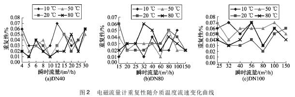將實驗測得的dn150深井水流量計在不同溫度及流速下的重復性數據整理,特性曲線如圖2所示,3組曲線分別對應DN40、DN80、DN100的3塊dn150深井水流量計的重復性曲線。