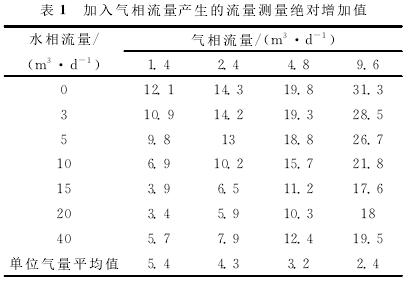 利用清水中渦輪的刻度方程計算加入不同氣體流量后渦輪響應(yīng)頻率所對應(yīng)的流量,即為加入氣體后的測量流量,再用所得測量流量減去配比的標準水流量,得到氣相加入后測量的絕對增加值,即加入氣相流量產(chǎn)生的測量誤差(見表1)。計算結(jié)果表明,加入氣體流量后,渦輪的測量流量明顯增加,尤其是液相流量較低時,增加的測量流量更高,氣體對流量測量產(chǎn)生了較大的測量誤差。低氣量下,平均1m3/d的氣量產(chǎn)生的測量誤差大約相當于5m3/d(絕對增加值)。