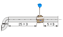 若傳感器安裝點的上游在同一平面上有二個90°彎頭,傳感器上游應有不小于25D的等徑直管段,下游應有不小于5D的等徑直管段。