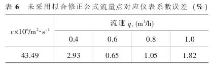 為證明該高粘度變流速自適應(yīng)算法及公式的有效性,重新選取四個流量點:0.4m3/h、0.6m3/h、0.8m3/h、1.0m3/h對該公式以及算法進行精度驗證,得到表4數(shù)據(jù),表5為各對應(yīng)流量點的擬合后儀表系數(shù)的誤差。