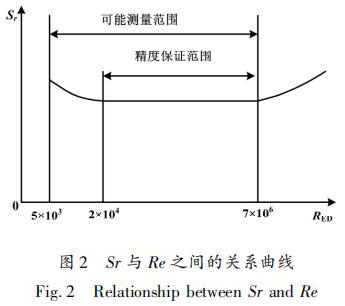 斯特勞哈爾數(shù) Sr 與雷諾數(shù) Re 之間的關(guān)系曲線如圖 2 所示。當阻流體尺寸確定后