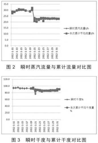 根據錐型孔板流量計在稠油 SAGD 的應用數據,將瞬時蒸汽流量與累計平均流量、瞬時干度與累計平均干度、瞬時蒸汽流量與鍋爐流量、累計平均流量與鍋爐流量、瞬時干度與鍋爐干度、累計平均干度與鍋爐干度、瞬時流量誤差與累計流量誤差、瞬時干度誤差與累計平均干度誤差繪成散點圖(圖 2 - 圖 5)。