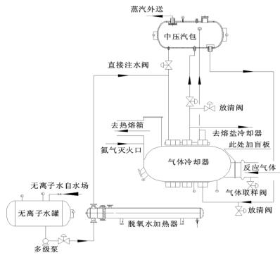 來自無離子水罐的脫氧水經(jīng)多經(jīng)泵加壓、經(jīng)脫氧水加熱器加熱后進(jìn)入到煤氣流量計(jì)的水段,脫氧水與反應(yīng)氣體換熱后分兩路:一路進(jìn)入中壓汽包,保證汽包有穩(wěn)定的液位;一路進(jìn)入熔鹽冷卻器帶出熔鹽攜帶的反應(yīng)熱。來自中壓汽包的高溫水經(jīng)管路接至煤氣流量計(jì)汽段底部,高溫水與反應(yīng)氣體換熱后產(chǎn)生高壓蒸汽,高壓蒸汽又返回中壓汽包。汽包還有一路直接注水管路,此路水不經(jīng)過煤氣流量計(jì)水段,而是直接進(jìn)入汽包。在煤氣流量計(jì)出口溫度偏低而汽包液位也比較低時(shí),可開此直接注水管路來穩(wěn)定汽包液位。其詳細(xì)流程圖如圖 2。