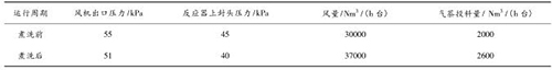 煤氣流量計(jì)煮洗吹掃后,裝置運(yùn)行期間無燃爆事故,且裝置運(yùn)行的風(fēng)量明顯提高,系統(tǒng)阻力明顯降低,投料量增加?,F(xiàn)將煮洗前后的運(yùn)行數(shù)據(jù)對(duì)比如下: