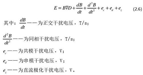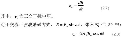 從上圖 2.5 中可以觀察到兩個電極、勵磁線圈、轉換器內阻之間形成了一個閉合回路,將此回路稱之為初級繞組,從理論上進行分析,磁力線 B 應當平行于勵磁線圈所產生的磁感應線,但在實際的應用過程中由于工藝差異,因此無法達到理想狀態,會產生磁力線穿過勵磁線圈磁感應線的情況,此時將會產生相應的感應電動勢,將此部分感應電動勢稱為變壓器效應。此效應同樣滿足于楞次定律,利用楞次定律進行計算可得如下電動勢: