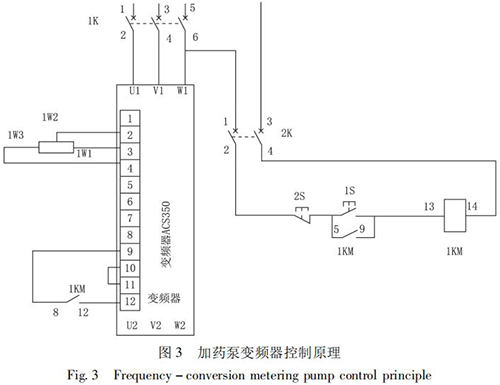 STD - Ⅲ型浮選工藝參數自動測控系統通過雙膜盒差壓計測量原礦漿濃度; 采用高壓泥漿流量計測量原礦漿流量,由 PLC 計算出入浮干煤泥量和藥劑的瞬時添加量,用變頻式計量泵完成浮選藥劑的添加。通過上位機還可以打印小時、班、天及月的運行數據,更加有利于生產管理及技術分析,藥劑自動原理如圖 2 所示,k1、k2、k3 是計算修正參數。以 PID 算法為核心,通過優化控制程序計算出藥劑給定量,在捕收劑和起泡劑管道上分別安裝藥劑測量裝置,用于檢測藥劑的添加量。當藥劑測量值小于藥劑給定量時,PID 輸出增大,反之則減小。加藥泵變頻器控制原理如圖 3 所示。