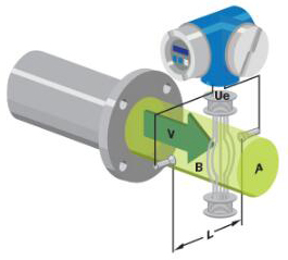 基本上,當導(dǎo)電液體流過磁場時,會感應(yīng)出電壓。為了測量該產(chǎn)生的電壓(與流動的液體的速度成正比),使用了兩個彼此相對安裝的不銹鋼電極。