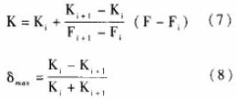 輪流量傳感器的儀表系數(shù)K與Q的關(guān)系近似線性的單調(diào)函數(shù)(見圖2)。因此,在對(duì)檢定結(jié)果進(jìn)行處理時(shí),直接將各檢定點(diǎn)的檢定結(jié)果以Fi、Ki的形式存入二甲苯流量計(jì)的數(shù)值運(yùn)算部分,不必對(duì)其儀表系數(shù)取平均值。在使用渦輪流量傳感器進(jìn)行流量測(cè)量時(shí),根據(jù)渦輪流量傳感器的信號(hào)頻率F,即可在以上檢定結(jié)果中檢索各F,值,找出滿足F,≤F≤F的Fi、Fi+1(i=1,2,.,.n-1),n是該渦輪流量傳感器的流量檢定點(diǎn)數(shù);若信號(hào)頻率F=Fi或F=Fi+1,則相應(yīng)的Ki或K.i+1即為所需的儀表系數(shù);若信號(hào)頻率Fi