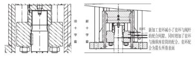 4)優(yōu)化閥桿與閥座的對(duì)中性,由于原設(shè)計(jì)結(jié)構(gòu),閥桿與閥座的對(duì)中性不易保證,此次加工新導(dǎo)向十字套減小了套環(huán)與閥桿的配合間隙,同時(shí)增加套環(huán)與操縱座套筒的配合,優(yōu)化后的導(dǎo)向十字套結(jié)構(gòu)自身能夠保證閥桿的定位及對(duì)中,如圖3。