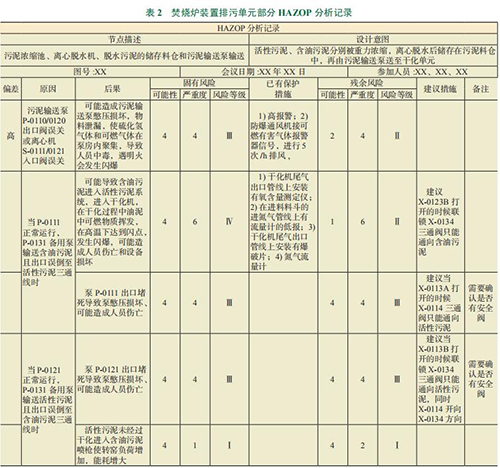焚燒爐裝置排污單元在下列Ⅳ級風險、Ⅲ級風險沒有核實整改完成之前運行存在較大風險。如表 2 所示,污泥濃縮池、離心脫水機、脫水污泥的儲存料倉和污泥輸送泵輸送節點中,存在 2個參與風險等級在Ⅲ級以上的問題:1)當 P-0111正常運行,P-0131 備用泵輸送含油污泥且出口誤倒至活性污泥三通線時,泵 P-0111 出口堵死導致泵憋壓損壞,可能造成人員傷亡,風險等級為Ⅲ;2)當 P-0121 正常運行,P-0131 備用泵輸送活性污泥且出口誤倒至含油污泥三通線時,泵 P-0121出口堵死導致泵憋壓損壞,可能造成人員傷亡,風險等級為Ⅲ。