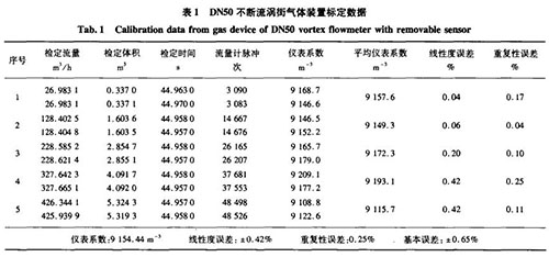 在實(shí)際標(biāo)定過程中,相同口徑的不斷流渦街與普通管道煤氣流量計(jì)在可測(cè)流量范圍、基本誤差、重復(fù)性等參數(shù)上基本一致,達(dá)到了設(shè)計(jì)和使用精度的要求。