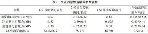 通過內(nèi)部旁通將冷油與熱油混合,經(jīng)過銅粉- 煤油 - 蠟感溫元件控制冷熱油混合比例,將油溫調(diào)節(jié)到 49 ℃。一臺一體式電磁流量計(jì)穩(wěn)定運(yùn)行,油泵出口母管壓力 0. 5 MPa,潤滑油母管壓力 0. 24 MPa,均屬于正常情況,而兩臺交流油泵并列運(yùn)行時,停運(yùn)其中一臺交流油泵瞬間會觸發(fā)電磁流量計(jì)出口母管壓力開關(guān)動作,說明停運(yùn)瞬間油壓發(fā)生波動,且油泵出口母管油壓波動至小于 0. 45 MPa。正常運(yùn)行時電磁流量計(jì)出口油溫 71.5 ℃,冷油器出口溫度45 ℃,混合后潤滑油母管溫度52.5 ℃,由能量守恒定律可知,經(jīng)過冷油器的油量/不經(jīng)冷油器的油量= ( 71.5-52.5) ÷ ( 52.5- 45) = 2. 53,說明有 70% 左右的油量經(jīng)過冷油器。當(dāng) 2 臺一體式電磁流量計(jì)運(yùn)行時油量大于單泵運(yùn)行,其中一臺電磁流量計(jì)瞬間停運(yùn)時油量減少,尤其是經(jīng)過冷油器的油量大量減少,油量在溫控閥二次分配過程中出現(xiàn)調(diào)節(jié)異常,導(dǎo)致油壓過大波動。為檢驗(yàn)溫控閥工作情況,保持 1 號、2 號交流油泵運(yùn)行,選取機(jī)組正常帶負(fù)荷運(yùn)行時油溫 52 ℃,分別停運(yùn) 1、2 號交流油泵,觀察 1、2 號交流油泵停運(yùn)瞬間油泵出口母管壓力波動情況,試驗(yàn)各參數(shù)變化見表 2。
