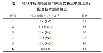 在實際應(yīng)用中,使用輕型注脂防噴裝置與內(nèi)流式集流智能型渦輪流量計配套技術(shù)對喇叭口在射孔層上注聚井進行測試。輕型注脂防噴裝置與內(nèi)流式集流智能型渦輪流量計配套技術(shù)施工工藝參見文獻,測試情況見表 1 所示,低注入量井( ≤10 m3 /d) 占到 56. 60% 。
