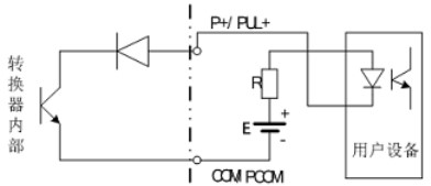 PUL+/ P+、ALM+(AH)、ALM-(AL)和 PDIR(FDIR)均為集電極開路(OC 門)輸出(參閱圖 3.6b、3.6d,用戶接線時必須參照如下電路外接電源和負載: