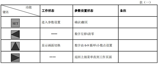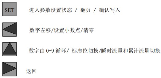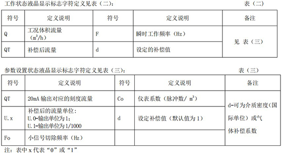 (3)標況流量計算公式(若補償后單位為 U.0):(4)標況流量計算公式(若補償后單位為 U.1):注:標況指 20℃,1 標準大氣壓三、一體化液晶顯示表頭參數設置操作說明(V03Z)1、鍵盤按鍵說明2、 顯示窗字符說明注:表中 x 代表“0”或“1”;Zn:標準狀態下(20℃,1 標準大氣壓),被測氣體的壓縮系數,Z:工作狀態下被測氣體的壓縮系數3、 操作說明3.1、本儀表表頭采用自導引式和菜單式相結合的參數設置方式,所謂自導引式參數設置方式就是用戶在進入菜單 00 項后,表頭中的微電腦會自動導引用戶去設置需要設置的參數。另外,用戶也可以通過菜單模式分別對各組參數進行設置。蒸汽測量菜單框圖如下:3.2、參數設置約定:在設置各項參數時,提示符閃動代表該項參數沒有設置完或者尚未確認,可以通過按SET 鍵來確認或者按→鍵退出;提示符不閃動代表該項參數已設置完并確認,此時可以通過按 SET 鍵翻頁或者按→鍵退出。進入參數設置時,需要輸入密碼(6 位)并確認進入,為了防止誤進入參數設置菜單,保證儀表正常工作,在設置密碼時,使用↑鍵調數時不能循環調數,只能單次調數,只有密碼輸入正確進入各項參數設置菜單后才可以對各位循環連續調整數據。3.3、儀表參數設置舉例:儀表出廠前各項參數已設置好,用戶無需設置。如果用戶需要設置某項參數,請參照以下步驟,例如修改刻度流量值 QT:在工作狀態下,按 SET 鍵,顯示屏顯示 P,數字位為全零,8 秒鐘若無操作,自動返回工作狀態。輸入密碼 :按數字↑鍵和左移←鍵,輸入密碼數 xxxxx(出廠時默認密碼為 000123),↑鍵調各位數字 0-9,每按 ←鍵一次數字向右循環一位,可通過多次按←鍵對整段數字清零,按→鍵可以返回工作狀態。菜單選擇項:按 SET 鍵確認,顯示屏顯示如右圖所示,末行“00”閃動調整該項值選擇不同參數設置菜單。該例直接按 SET 鍵進入菜單 00 項設置刻度流量:QT 閃動,*一步:*先進行小數點調整,可以通過←鍵對參數快速清零或者通過↑鍵進行小數點調整,調整完畢,按 SET 鍵確認(QT 仍閃動);*二步:數值調整,可以通過↑鍵對每位數字進行調整,按 ←鍵一次數字向右移動一位,調整完畢,按 SET 鍵確認,QT 停止閃動,該項參數設置完畢,可進行下一項參數設置或者退出另外,單位設置 U.X 和補償方式設置 dX 通過↑鍵調整修改。3.4、校驗項說明: 儀表出廠前,溫度和壓力通道已校驗設置好,無需用戶重新校驗。校驗通道有密碼保護,廠家不對外開放,如果需要重新校驗溫度或者壓力通道,請專業人員與廠家技術人員聯系。4、計算公式說明4.1、蒸汽測量計算公式(1)渦街流量儀表工況體積流量計算公式:(2)密度 d,單位 Kg/m3(3)質量流量計算公式,單位 Kg/h:(4)質量流量計算公式,單位 t/h:4.2、氣體測量計算公式----標況指 20℃,1 標準大氣壓(1)渦街流量儀表工況體積流量計算公式:(2)對比壓縮系數 d(Zn/Z),單位 1(3)標況流量計算公式,單位 Nm3/h:P1—工況絕壓,PN—標況絕壓(Mpa),T1—工況熱力學溫度,TN—標況熱力學溫度(K)