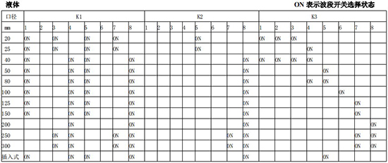 (4)標況流量計算公式,單位 t/h:四、AMPKP09A01 放大板波段開關調整參照表五、AMPSW10A01 放大板波段開關調整參照表RG=1-F 調放大器增益,由 1 至 F 依次增大(常用 4-8);RS=1-F 調觸發靈敏度,由 1 至 F 依次提高(常用 4-8)不同口徑和介質開關選擇參見附表。并根據實際信號先調整 K2 和 K3 擴展頻帶,必要時調整 K1 電荷放大器增益以上表值僅供參考,實際使用中因液體粘度和氣體密度不同應在此值附近調整,頻率低時可將 K3 向大口徑方向調一至三檔。頻率高時可將 K2 向小口徑方向調一至三檔。訂貨須知及選型樣譜一.尊敬的用戶,當您要選用本公司產品時,請仔細閱讀選型樣本,并做好以下工作:1.認真核對被測介質的工況條件:溫度、壓力、管徑等工藝參數。2.認真核對被測介質的使用流量范圍,特別是*小流量值以*終確定使用儀表的口徑及配管參數。3.確定儀表的安裝地點,保證直管段,并為儀表的安裝維護創造好的環境條件。4.填好訂貨咨詢單,見附表三二.渦街流量儀表選型表(符合 JB/T9294-1999 標準)1.傳感器選型表上一篇:污水流量計的種類