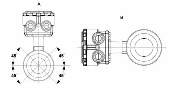 如果兩個測量電極處于 3 點鐘和 9 點鐘位置或與水平方向成 45 度以下角度,如 圖 3-4 左側所示,則傳感器電極的朝向正確。避免使傳感器的頂部與垂直位置成 90 度角(如 圖右側所示)的任何安裝朝向。