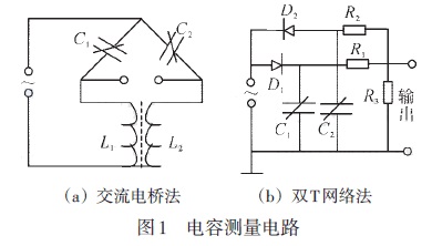 差壓液位變送器的測量電路如圖1所示,變送器的輸出可以轉換成電壓、電流或頻率等信號,然后放大。圖1(a)的交流電橋法是將兩個電容器接于交流電橋的兩個相鄰臂上,交流電橋的輸出經放大與相敏檢波后進行測量。圖1(b)的雙T網絡法壓差引起的電容變化轉換成電壓變化輸出。在交流電源正半周時,通過二極管D1對電流器C1進行充電,在負半周時,電容器C1經電阻R1與R3進行對地放電;而電容器C2 則在電源的負半周充電、正半周對R3 與R2 反向放電。因此R3上兩端的電壓輸出是由C1與C2的平均放電電流之差所決定的。當壓差為零時,C1、D1、R1與C2、D2、R2的參數相同,則通過R3的平均放電電流之差為零。當壓差不等于零時,差動電容C1與C2一個增大一個減小,使兩者的平均放電電流不相等,因此R3兩端的電壓輸出也就有了相應的變化。