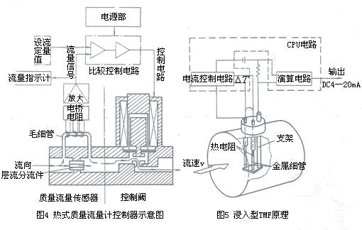 市場上熱分布式tmf按測量管內(nèi)徑分為細管型(也有稱毛細管型)和小型兩大類,結(jié)構(gòu)上有較大區(qū)別。小型測量管儀表只有直管型,內(nèi)徑為4mm;細管型測量管內(nèi)徑僅0.2~0.5mm。稍大者為0.8~1mm,極容易堵塞,只適用于凈化無塵氣體。細管型儀表還有一種帶有調(diào)節(jié)單元和控制閥等組成一體的熱式質(zhì)量流量控制器,結(jié)構(gòu)如圖4所示。