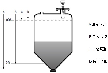 注:使用瀝青液位計時,務必保證*高料位不能進入測量盲區(圖中D所示區域)。
