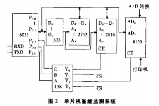 (3)單片機智能監測系統該部分由8031單片機、地址鎖存器7415373、EPROM2732、E²PROM2816、并行接口8l55、地址譯碼器74LS138組成,如圖2所示: